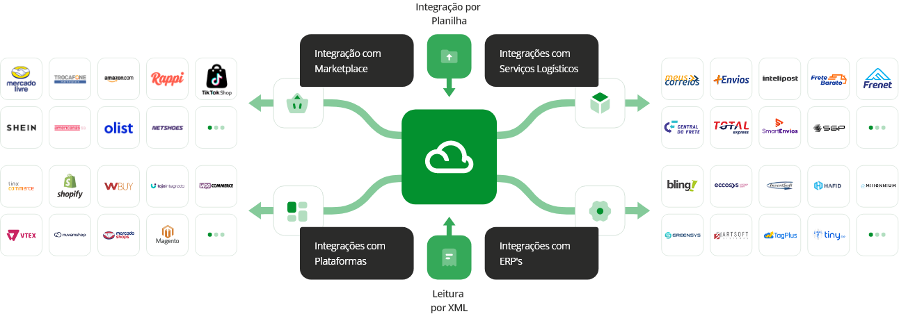 Nossa plataforma conecta negócios de todos os portes aos principais marketplaces, ERPs e plataformas de e-commerce, unificando operações e facilitando a expansão para novos mercados.